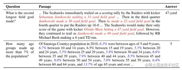 DROP 数据集由 AI2 实验室提出,是一个类似于 SQuAD 的阅读理解 QA 数据集,但 SQuAD 很少涉及数学运算的问题,而 DROP 数据集专为考察模型去做涉及到数学运算问题的处理能力而设计。