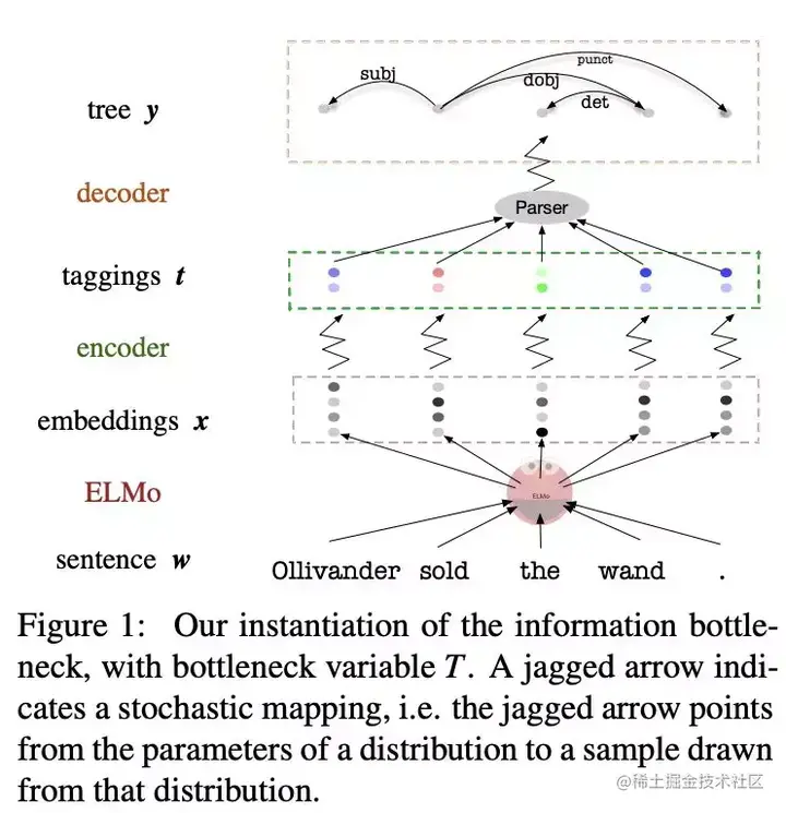 我们用瓶颈变量t来实例化信息瓶颈。锯齿形箭头表示一个随机映射,即锯齿形箭头从一个分布的参数指向从该分布抽取的样本。