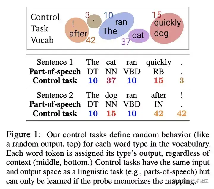 控制任务为词汇表中的每个单词类型定义随机行为(如随机输出)。无论上下文如何,每个单词标记都被分配其类型的输出。控制任务与语言任务(例如,词性任务)具有相同的输入和输出空间,但是只在探针记住映射时才能学习。