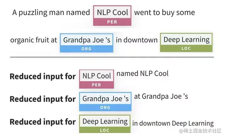 使用AllenNLP Interpret为NER生成的解释。该模型为一个输入(顶部)预测三个标签,我们分别解释每个标签。