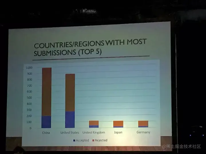 下图是提交论文最多的5个国家/地区,中国提交的论文最多,接近1000篇,其次是美国,但美国被录取的论文更多。