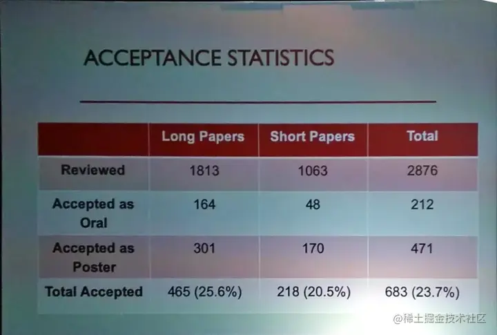 有38篇论文因为各种原因被拒,因此最终评审的论文是2876篇,录取论文683篇,录取率为23.7% 。其中,录取为Oral论文的有212篇。