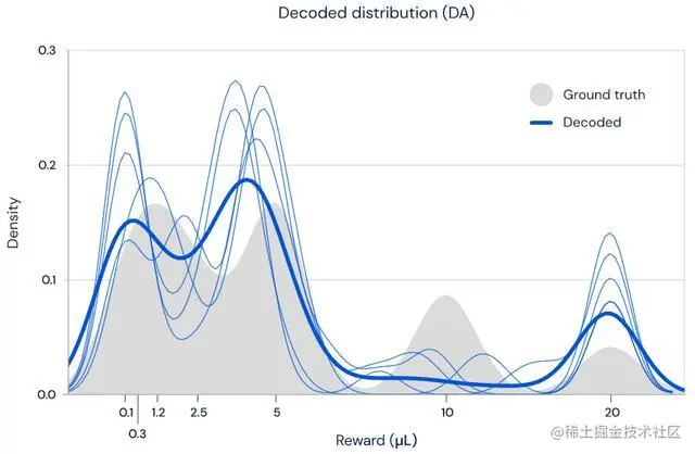 最后一个问题是,是否可以从多巴胺细胞的放电速率中解码奖励分布。 如上图所示,我们发现确实有可能仅使用多巴胺细胞的放电速率来重建奖励分布(蓝色),该分布与实际奖励分布(灰色区域)非常接近。