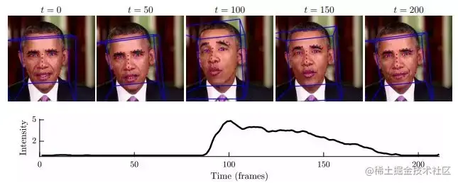 图1 上面所示是来自250帧剪辑片段中的五个等距帧,显示了对OpenFace的跟踪结果。下半部分为此视频剪辑上测量的一个动作单元AU01(眉毛抬起)的程度。