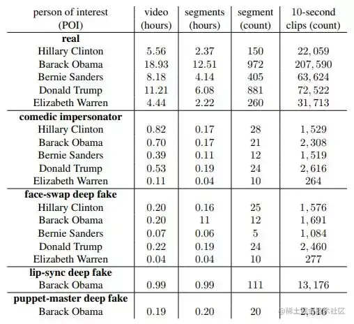 表1. POI正在讲话的下载视频和段的总持续时间,以及从段中提取的段和10秒剪辑的总数。