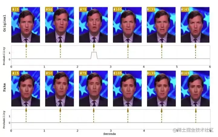 早期的Deepfake生成的假视频缺陷明显,比如人物说话时从不眨眼,现在这个缺陷已被修复