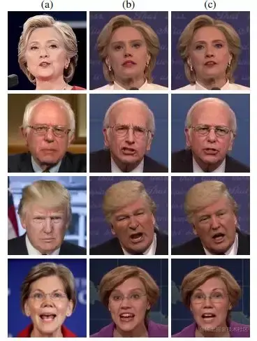 图5:(a)真实的样本框架; (b)喜剧模仿假视频样本框架; (c)四个名人的换脸Deepfake假视频的样本框架