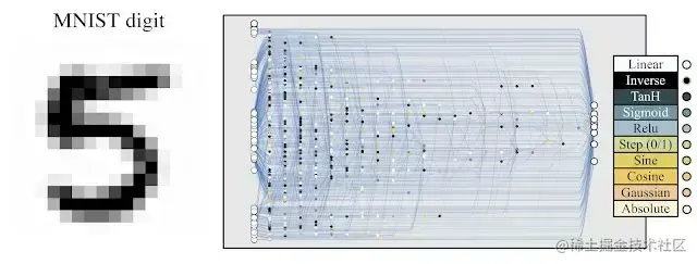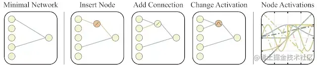 左:一个最小的网络拓扑结构,输入和输出仅部分连接。中间:网络的改变有三种方式:(1) 插入节点:通过分割现有连接插入新节点。(2) 添加连接:通过连接两个先前未连接的节点来添加一个新连接。(3) 更改激活:重新分配隐藏节点的激活函数。右:可能的激活函数 (线性,阶跃,正弦,余弦,高斯,tanh, sigmoid,inverse,绝对值,ReLU)