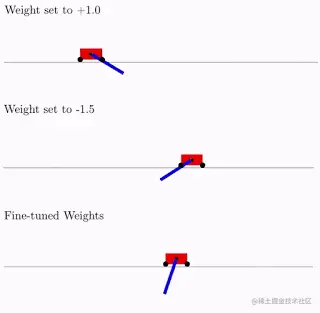 与传统网络不同的是,我们可以通过简单地找到最佳的单个共享权重参数来训练 WANN,从而最大限度地提高其性能。在下面的例子中,可以看到我们的架构 (在某种程度上) 使用恒定的权重来完成一个 swing-up cartpole 任务: