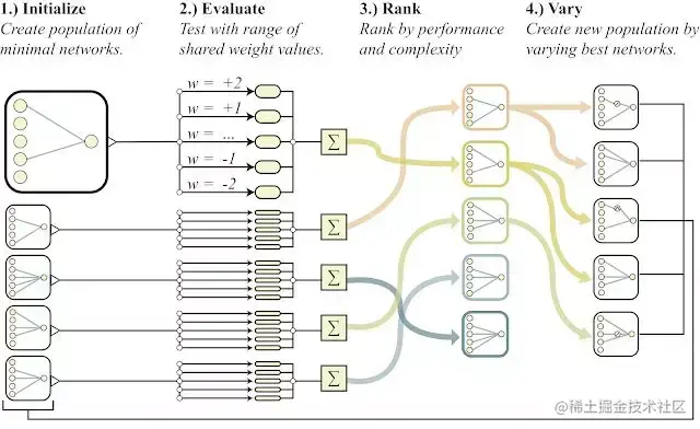 我们从一组最小的神经网络架构候选对象开始,每个候选对象只有很少的连接,并使用一个完善的拓扑搜索算法 (NEAT),通过逐个地添加单个连接和单个节点来演化架构。