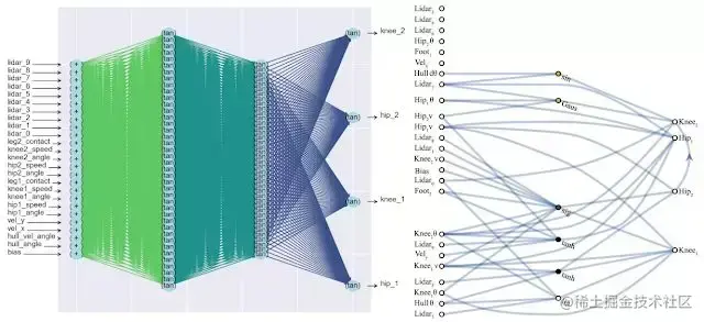 左图:一个手工设计的、完全连接的深度神经网络,有 2760 个权重连接。利用一种学习算法,我们可以求解 2760 个权重参数的集合,使该网络能够执行一个双足步行任务 (BipedalWalker-v2)。