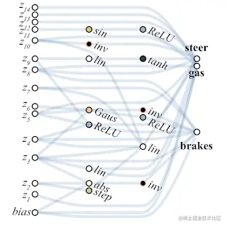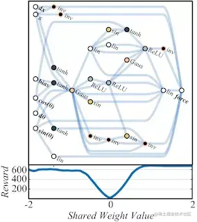 右图:一个权重无关的神经网络架构,只有 44 个连接,但同样能够执行双足步行任务。与完全连接网络不同的是, WANN 仍然可以执行任务,而不需要训练每个连接的权重参数。实际上,为了简化训练,WANN 被设计成在每个权重连接的值相同或共享时执行,甚至就算共享权重参数是随机采样的,也会起作用。