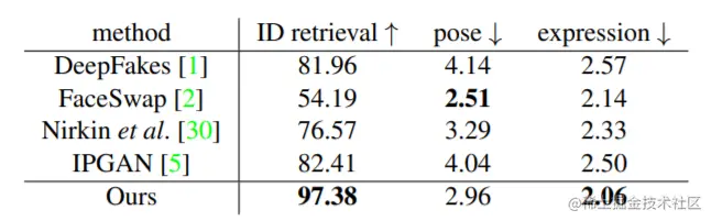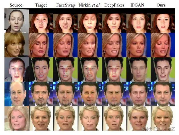 与FaceSwap、Nirkin、FaceForensics ++、DeepFake、IPGAN 等模型生成效果的比较。我们的模型更好地保留了源图像的脸部形状,也更忠实于目标属性(照明,图像分辨率)