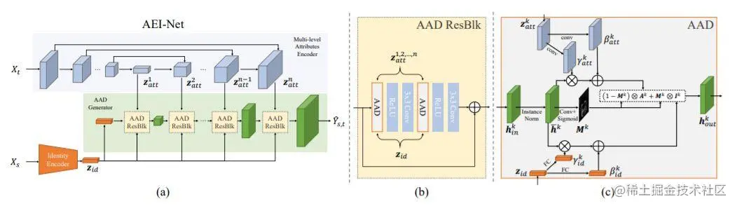 第一阶段的AEI-Net结构。AEI-Net由身份编码器,多级属性编码器和AAD生成器组成。AAD生成器使用在AAD层上构建的级联AAD ResBlk,可在多个功能级别中集成图像特征和属性的信息
