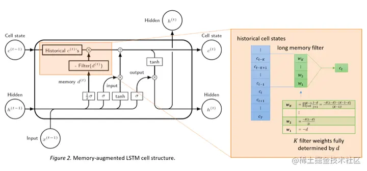 根据上述理论成果,我们对RNN和LSTM做出最小程度的修改,使其获得对长期相关性建模的能力。类似于ARFIMA模型中的结构,我们分别在RNN的输入和LSTM的状态单元处添加了一个长期记忆滤波器,得到记忆增强RNN和记忆增强LSTM模型。