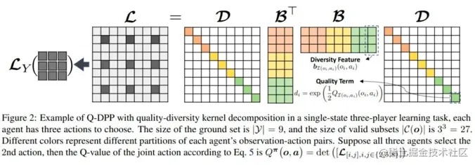 从直觉上来说,满足 DPP 的过程一般有一个性质是,相似的两个元素同时出现的概率是比较小的。基于此,我们提出一个Q-DPP,用作多智能体学习中联合Q值(Joint Q Value,Q(o, a))的函数估计器(Function Approximator)。