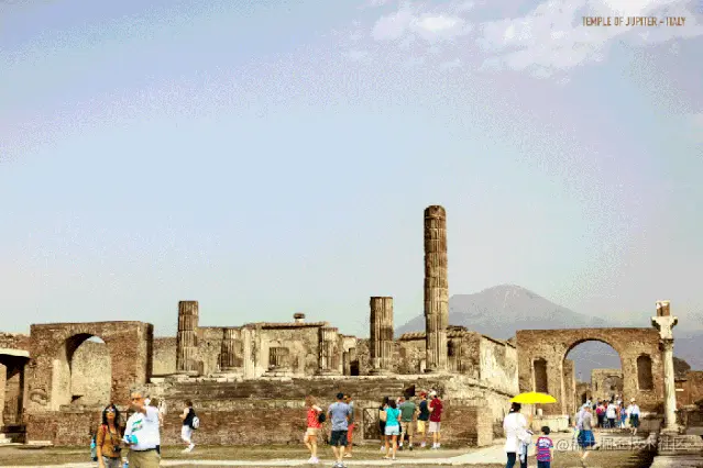 古希腊过后,接下来是一座来自古罗马的神庙——朱庇特神庙。神庙的后面是维苏威火山,这座火山的爆发摧毁了庞贝古城。这个遗址在16世纪被重新发现,多年的挖掘让每年数以百万计的游客来这里寻找古罗马的遗迹。
