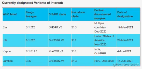 另一种变异毒株拉姆达(Lambda)被正式列为「需要关注的变异毒株」(Currently designated Variants of Interest)。