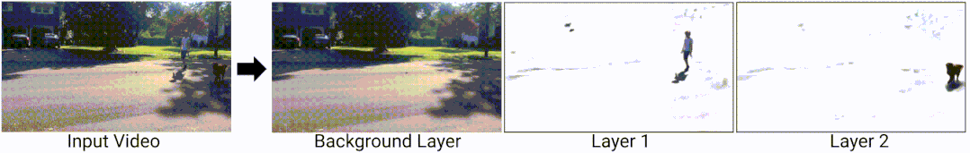 omnimatte可以在大部分图像或视频编辑工具进行操作,并且可以在任何使用传统蒙版的地方使用,例如,将文本插入视频中的烟迹下,效果真是牛。为了生成omnimatte,首先将输入的视频分成一组层: 每一个层用于一个移动的主体或是用于静止的背景物体。例如下图中可以看到,有一个图层用于人,一个图层用于狗,还有一个图层用于背景,当合并在一起使用传统的阿尔法混合方法,这些层可以重新合成这个输入视频。