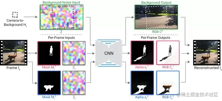 CNN 首先学习更强的相关性,然后才能正确地分解层。在预处理中,用户选择主体并为每个主体指定一个层。使用现成的分割网络(如 MaskRCNN)提取每个主体的分割遮罩,并使用标准的摄像机稳定工具找到相对于背景的摄像机转换。在背景参考帧中定义随机噪声图像,并利用摄像机变换进行采样,生成每帧噪声图像。噪声图像提供是随机但一致的图像特征,随着时间的推移,能够为 CNN 学习重建背景颜色提供一个自然的输入。