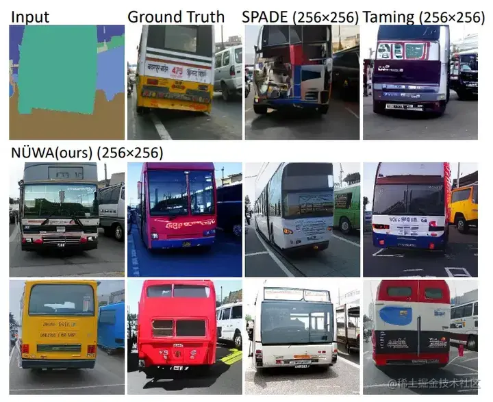 比如在第三个例子中,由NÜWA生成的蓝色卡车更加逼真,而且后方的建筑物也没有产生奇怪的变化。