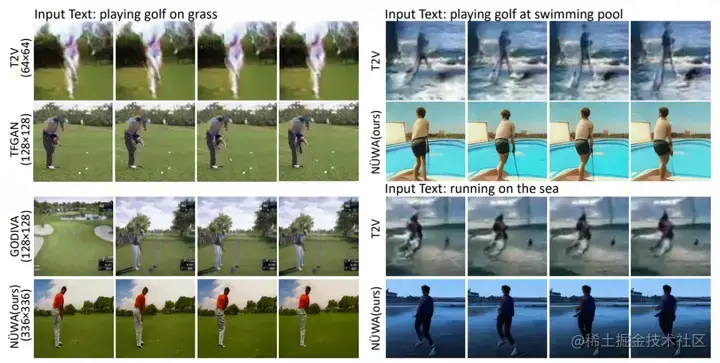 此外,对于生成未见过的文本来说,NÜWA在定性比较中显示出了强大的zero-shot能力,如「在游泳池打高尔夫球」以及「在海上跑步」。