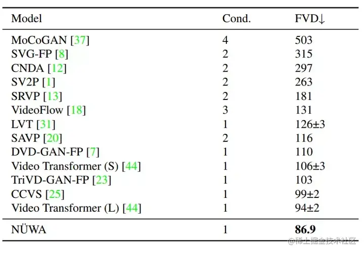 为了进行公平的比较,所有的模型都使用64×64的分辨率。尽管只给了一帧作为条件(Cond.),NÜWA仍将FVD的SOTA得分从94±2推至86.9。