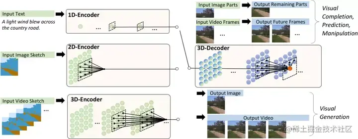 对于图像补全、视频预测、图像处理和视频处理任务,将输入的部分图像或视频直接送入解码器即可。