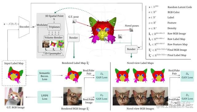 重建损失可以确保2D用户输入和相应的3D内容对齐,像素对齐条件鉴别器( pixel-alignedconditional discriminator)也进一步促使外观和标签对应合理,并在新视角时也保持像素对齐。