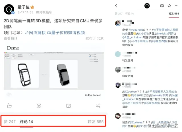 量子位在微博上搬运了朱俊彦团队的新成果,一个能将2D草图一键变成3D模型的新算法,却意外引发设计圈盆友们的热烈转发讨论。