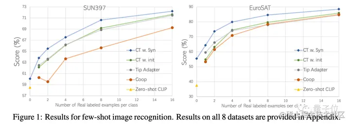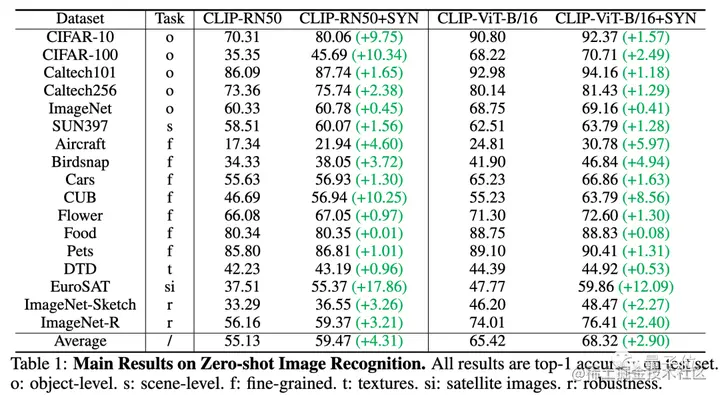 在17个数据集上,相⽐此前效果最好的CLIP模型,相关⼤⼩模型均获得了显著提升(4.31%/2.90%),展示了合成数据的有效性。