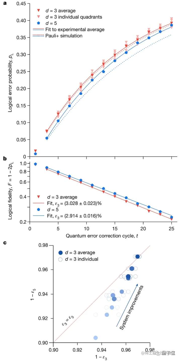 结果表明,较大表面码能展现出个更好的逻辑量子比特性能,即错误率更低。如下红蓝线对比: