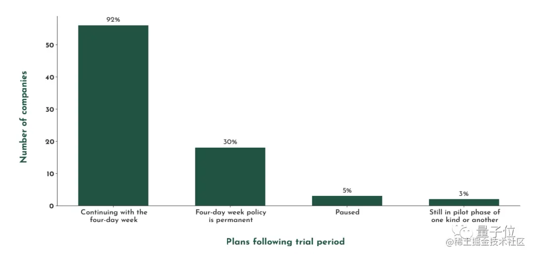 截至目前,在所有参与试验的公司中,有92% 的公司仍在推行4天工作制,有30%(18家)的公司甚至已把其改成了永久制度,只有3家公司停止试验。