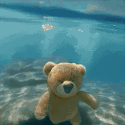 一只逼真的泰迪熊正在潜水;随后它慢慢浮出水面;走上沙滩;这是镜头拉远,泰迪熊行走在海滩边篝火旁。