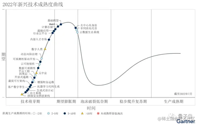 根据Gartner发布的2022年新兴技术成熟度曲线,生成式AI目前还处于“技术萌芽期”,预计距离生产成熟期还有5-10年的时间。
