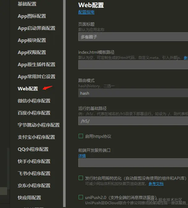 在uniapp工具里点击manifest.json。选择web配置,按照这个配置