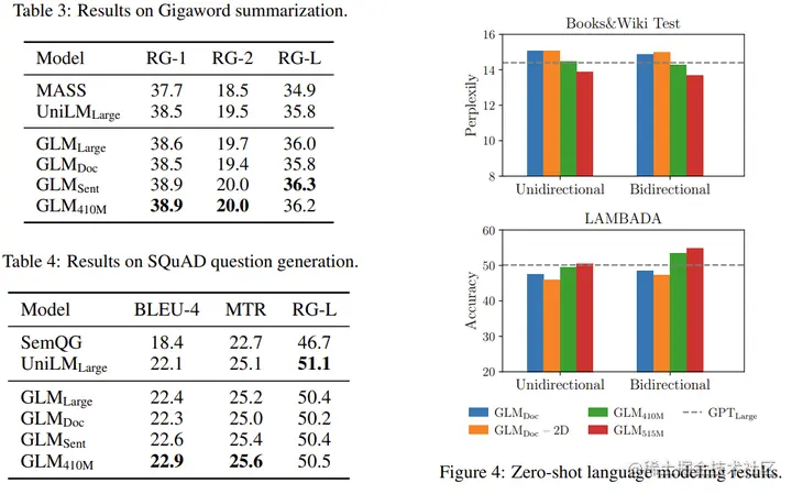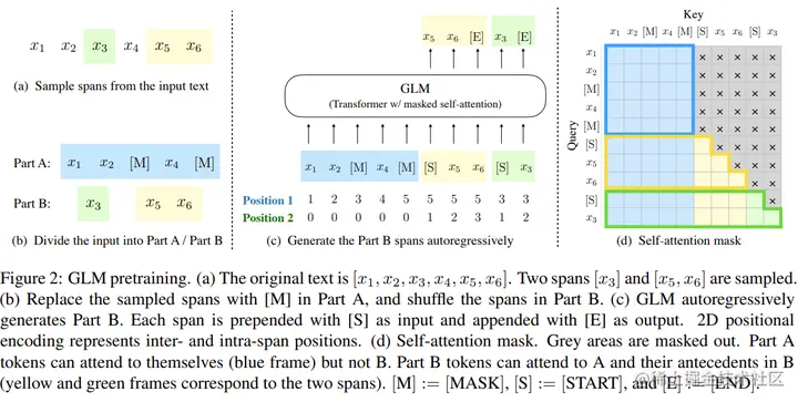 说明,对于一个文本:x1,x2,x3,x4,x5,空白长度会以λ=3的泊松分布进行采样。重复采样直到空白token的总数目占文本token数的15%。将文本分为两部分,A部分由原始token和[MASK]组成,B部分由空白token组成,最终将A部分和B部分进行拼接,同时B部分的每一个空白会被打乱,这样在自回归预测每个token的时候可以看到上下文的信息(具体通过注意力掩码来实现)。需要注意的是位置编码是2D的,位置编码1用于表示token在文本的位置,位置编码2用于表示原始文本和每一个空白中token的顺序。