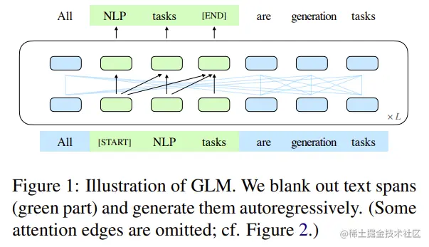 GLM的核心是:Autoregressive Blank Infilling,如下图1所示:
