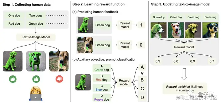 也就是当图像生成完成后,模型再给一堆文本,但其中只有一个是原始文本,让奖励模型“自己检查”图像是否跟该文本相匹配。