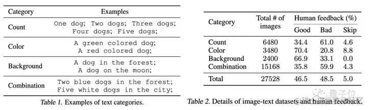为了简单起见,文本提示只包括以下四种类别,分别关乎数量、颜色、背景和混合选项;人类的反馈则只分“好”、“坏”与“不知道(skip)”。
