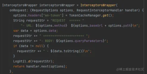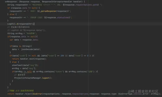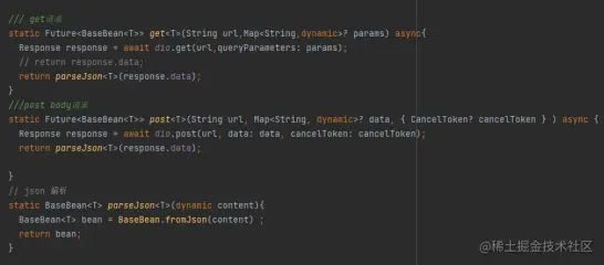 我们主要是对request跟response做些简单的封装,将日志打印出来,然后我们在response的时候对服务端返回的code解析一下,判断是否调用成功,如果不成功可以解析下msg,将服务端返回的信息toast提示出来。 然后我们封装post、get请求,对dio返回的结果做统一的解析封装,返回我们封装的Basebean对象,