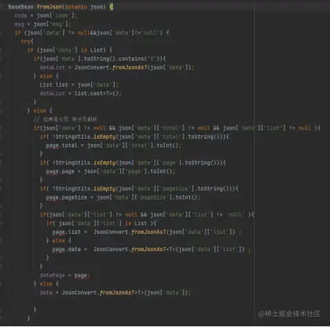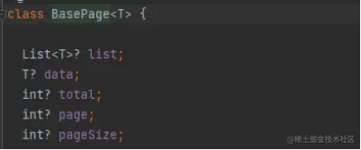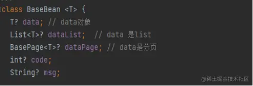 - 封装BaseBean基类 我们封装个Basebean返回基类,有通用的code、msg字段,然后定义三种类型的数据返回格式,一种是直接data对象,一种是list对象dataList,还有一种是分页对象dataPage,dataPage对象里有常用的分页字段,这三种基本可以满足服务端返回的通用格式。