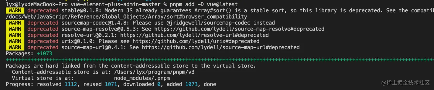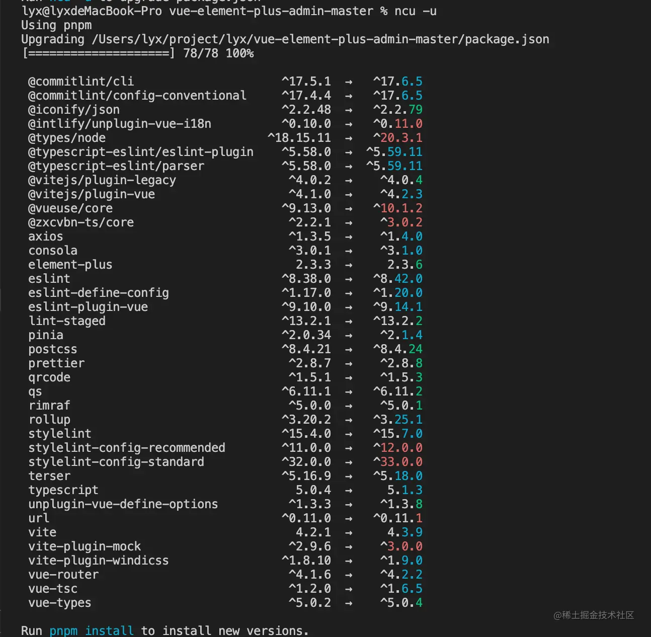 我这里用的是 pnpm install 命令来更新, npm/cnpm/yarn 需要执行自己对应的命令。这样一键更新所有模块就算完成了,启动后,如果有报错提示,只需要进行相依调整即可。