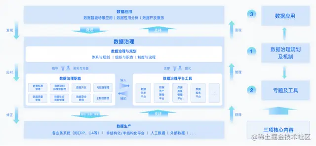 三大模块互为动力,数据治理规划指导数据治理职能的全面发挥,数据治理各项职能通过数据治理平台工具协助管理,数据治理平台工具支撑数据治理规划的落地及优化,数据治理规划各层面逐步固化在数据治理平台上,数据治理平台辅助数据治理各项职能的管理,通过数据治理各项职能不断落实和完善数据治理规划,实现组织数字化转型,固化管理机制及流程体系。