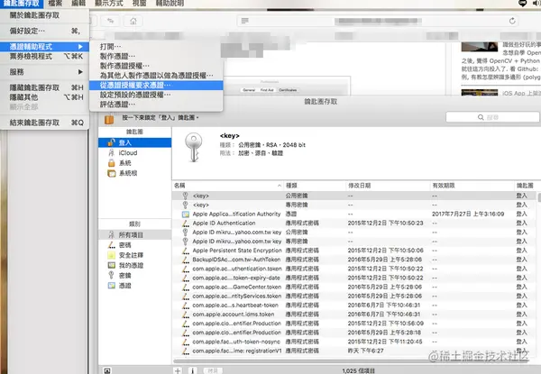 1.3 将「偏好设定」关掉后,打开「钥匙图存取」->「凭证辅助程式」->「从凭证授权要求凭证」