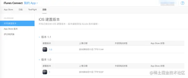 4.4 登入App Store Connect 查看上传的App 活动-> iOS建置版本,即可看到透过Xcode 上传的App 版本