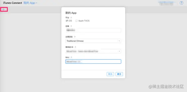 点选左上角的+ 号,并选择「新的App」,并填妥以下栏位后点选「建立」