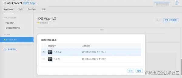App Store -> iOS App -> XX准备提交-> 建置版本。点选「+」号,选取刚刚透过Xcode 上传的建置版本,点选「完成」