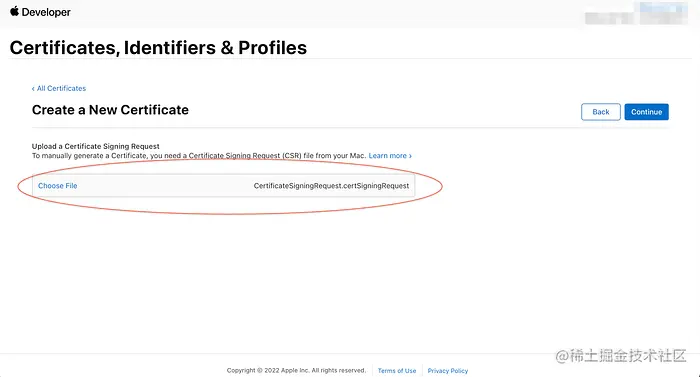 1.9 点选「Choose File」上传第一个步骤产生.certSigningRequest 档案后,点选「Continue」继续下一步