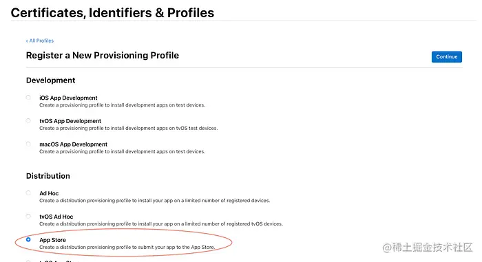 1.8 选取「iOS Distribution(App Store and Ad Hoc)」后,点选「Continue」继续下一步